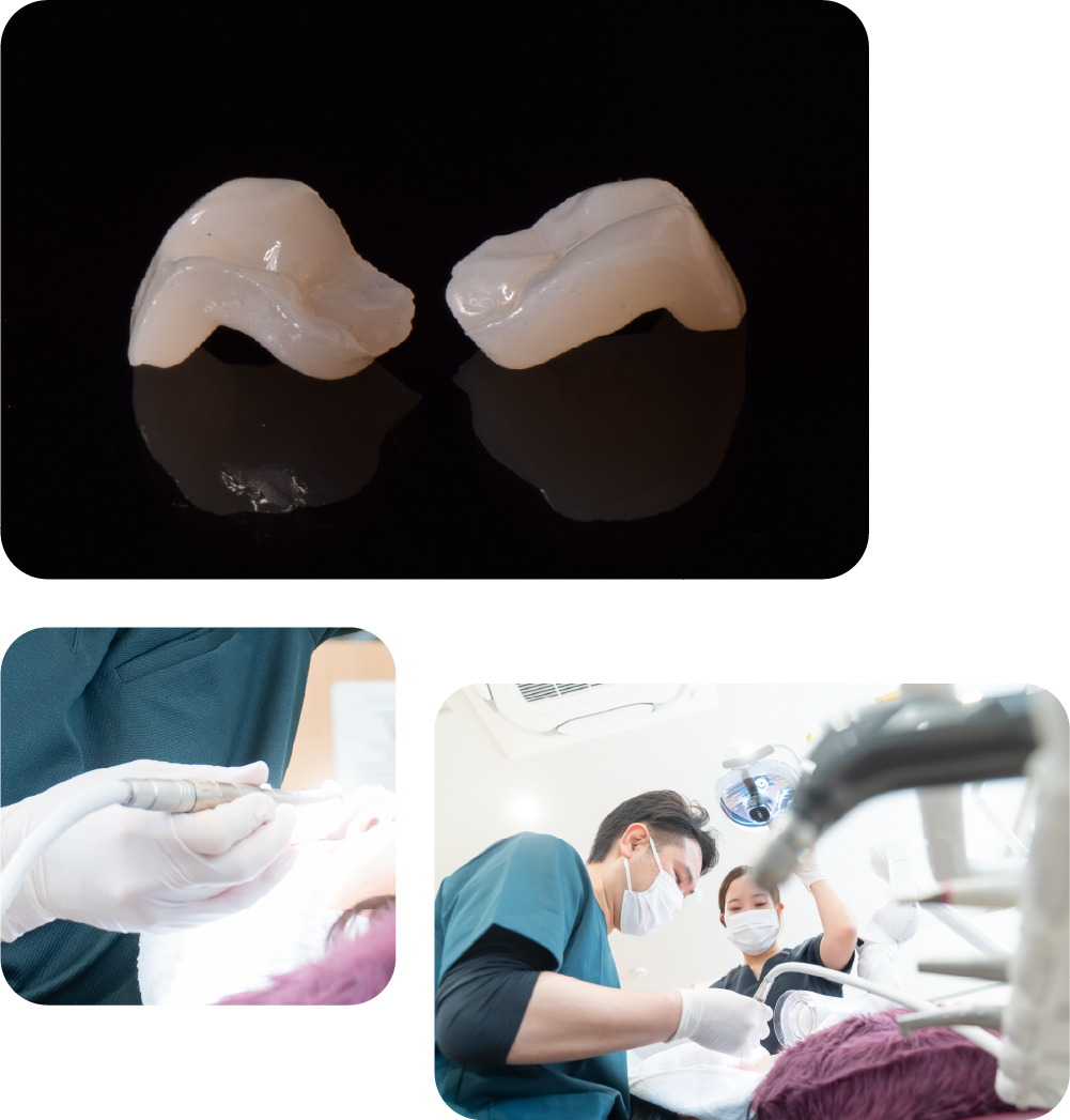 悪い部分だけを削ってコンポジットレジンと呼ばれる歯と同じ色の接着性樹脂を用いたダイレクトボンディングという治療法で、その日のうちに白い歯に治すことができます。